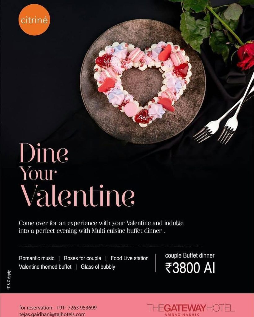 Dine with your valentine this 14th Feb, surprise your partner with amazing candlelight dinner, romantic music, wine and valentine’s theme buffet at The Gateway Hotel (Taj), Nashik all-inclusive at ₹3800